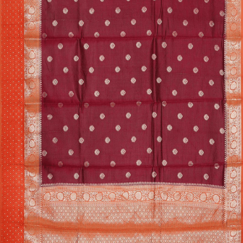 As fluid as a whispered secret, the Banarasi Chiniya Silk saree drapes the wearer in an aura of mystique and charm. This Banarasi Chiniya Silk Maroon Colour Saree is featured with a floral Zari Butta design all over the body. The saree has a gold Zari woven orange colour border with floral patterns. The pallu is beautified with floral motifs in gold Zari weaves.