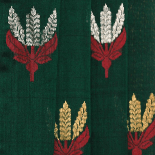 1) The Chanderi cotton silk leaf green saree dazzles with a beautiful Meenakari gold-woven exotic flower series across the saree.