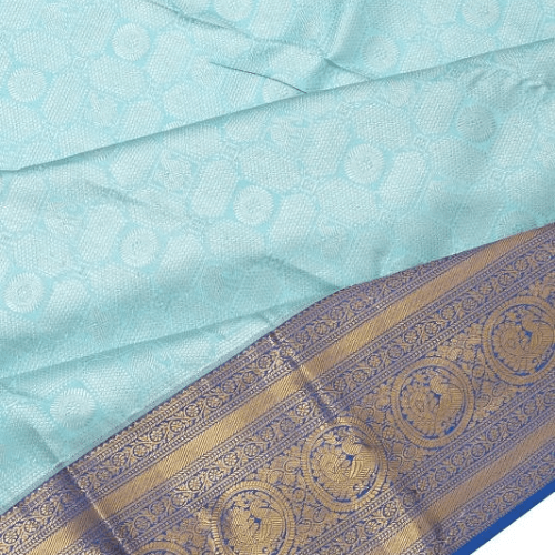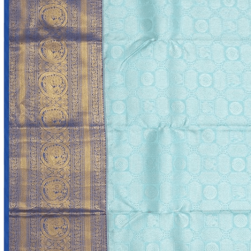 Step into elegance with this Taranga Kanchi Silk Brocade Saree in a serene sky blue shade. The silver zari brocade body adds a touch of allure, and the contrasting dark blue medium border with mayil motifs and floral vines enhances its charm. The pallu features a stunning gold zari brocade design with mayil motifs, completing the ensemble. Pair it with a contrast plain royal blue blouse adorned with zari borders for a sophisticated appeal.