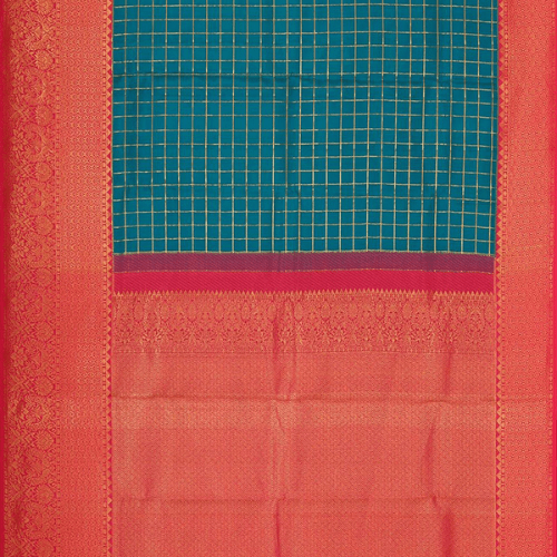 With every shimmering thread, Kanchipattu sarees embody the essence of femininity and grace, their intricate designs a testament to the skilled hands that weave tales of tradition. This Kanchipattu Peacock Blue Brocade Saree is featured with gold Zari check patterns all over the body. The saree has a gold Zari woven rani pink colour border with ‘Mayil’ and floral patterns. The pallu is enhanced with the same pattern and diamond motifs in gold Zari weaves.