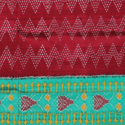 2) It has an Ikat-woven fish series border and sea green pallu enhanced with the Ikat-woven Meenakari flower series.