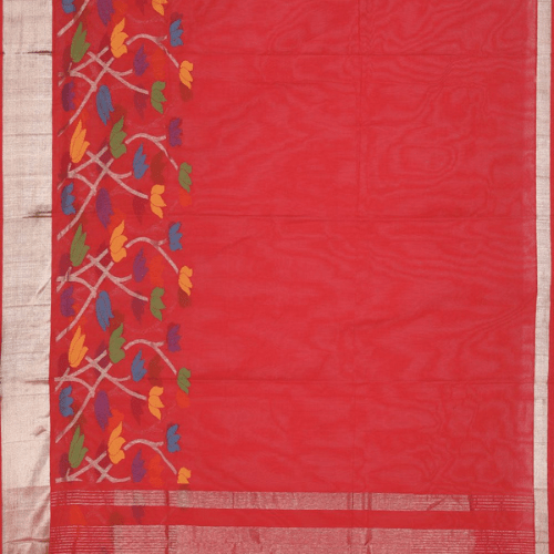 1) Simple yet elegant Venkatagiri-Cotton coral-pink, red mix tone saree, enhanced with intricate Jamdani weaved thread-silver lotus floral series, followed by a silver border.