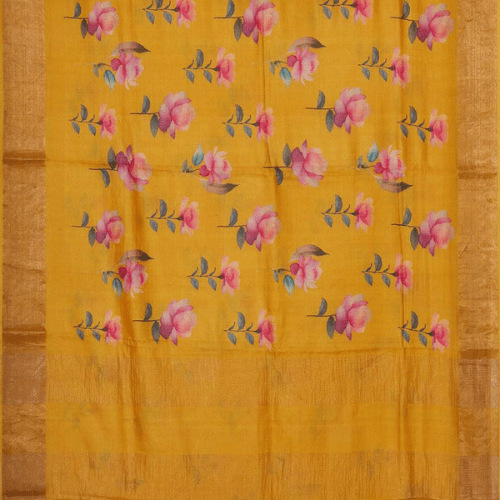 Silk sarees carry a regal allure, reminiscent of a bygone era of grandeur and sophistication. This Silk Mustard Yellow Saree is featured with lovely floral prints all over the body. The saree has a gold Zari woven kaddi border and the pallu is enriched with gold Zari stripes to complete the look.