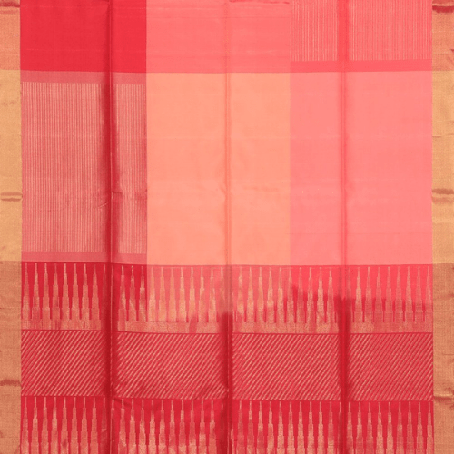 Gadwal Silk coral-pink saree accentuated with gold-woven tiny flower motifs across the saree. It has a temple, a gold-woven self-abstract line border on either side and a green pallu dazzled with zari diamond motifs adjacent to the floral vine.