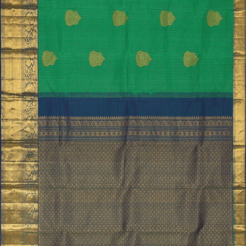 Crafted from the finest silk yarns, Kanchipattu sarees boast a luxurious texture that feels smooth against skin, exuding a sense of opulence and sophistication. This Kanchipattu Dark Green Brocade Saree is featured with gold Zari Butta and stripe designs all over the body. The saree has a gold Zari woven peacock blue colour kaddi border with ‘Annapakshi’ and floral patterns. The pallu is enhanced with diamond motifs in gold Zari weaves.